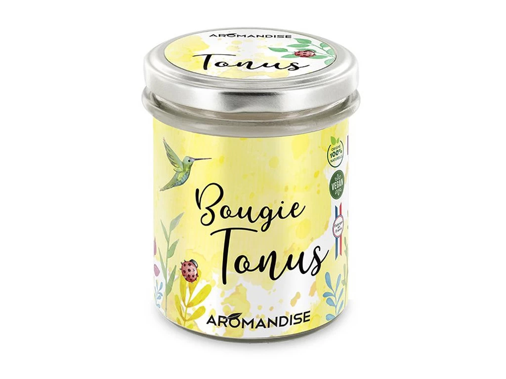 A la cire de soja sans OGM et aux huiles essentielles de Citron, Menthe poivrée, Citronnelle et Ravintsara. Mèche en coton.